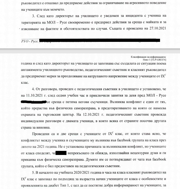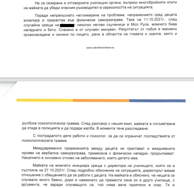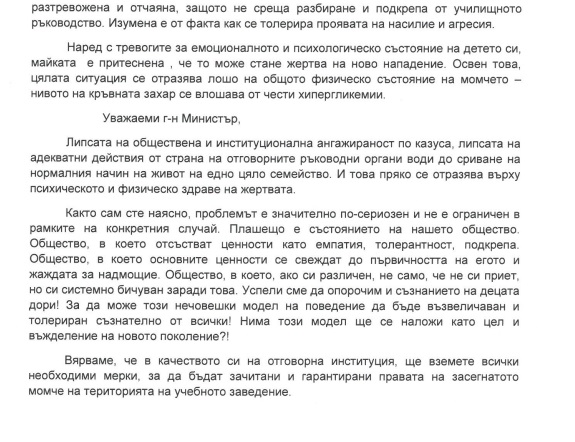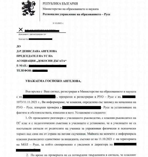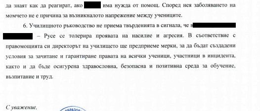 Благодарим на Министерство на образованието и науката за своевременната ответна реакция и намеса. Публикуваме и подадения от нас сигнал, за да може да се видят несъответствията в твърденията и на двете страни. Смятаме, че в качеството си на отговорна институция, МОН взема предвид единствено твърденията на проверяващата инстанция – РУО – Русе и на училищното ръководство. Твърденията на майката и на пострадалото дете са опровергани, дори изопачени. Отново пострадалата страна е виновна.