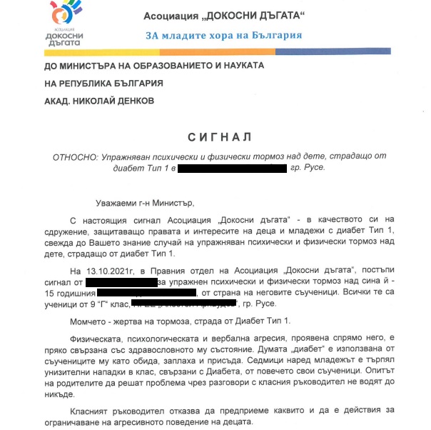 Официално становище на МОН във връзка с подаден сигнал от Асоциация „Докосни дъгата“ за случай на упражняван психически и физически тормоз над дете, с Диабет Тип 1